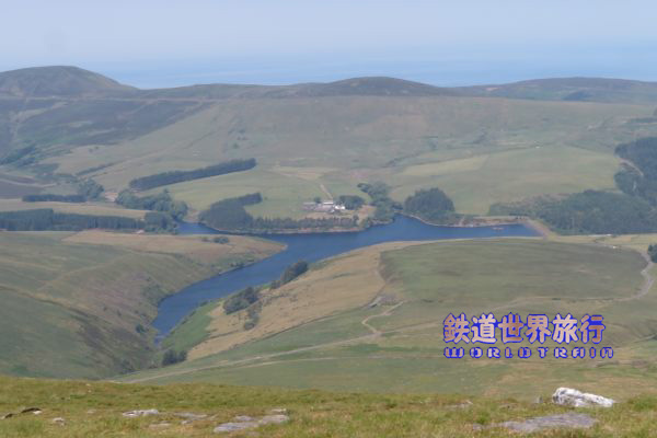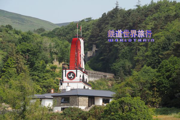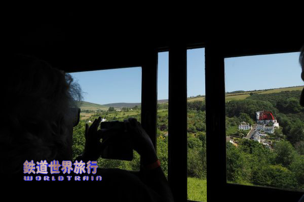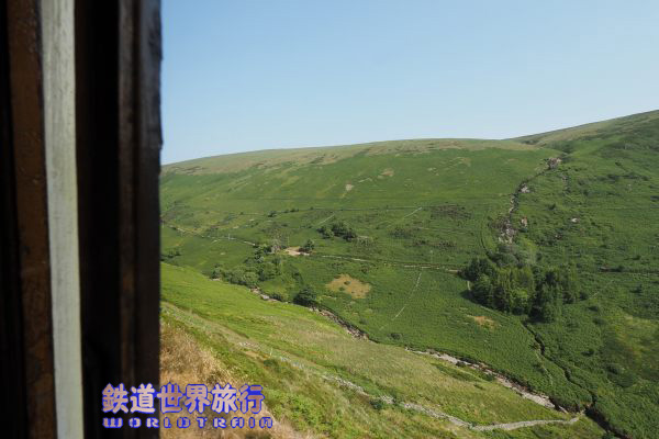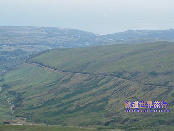 | ラクシーを出てすぐ勾配を登り始め進行方向右側に大水車The Great Laxey Wheelを見下ろす角度で見られる。 |