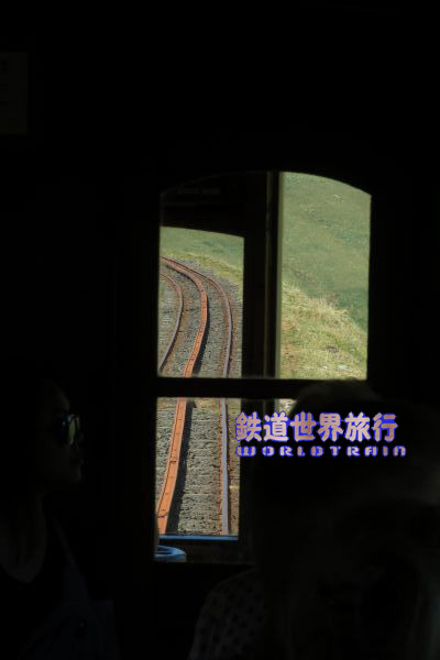 | 後方の席でも右の通路側からは前方が見える。 線路間に横になったレール状のものがあるが、ブレーキ用のレールでラックレールではない |