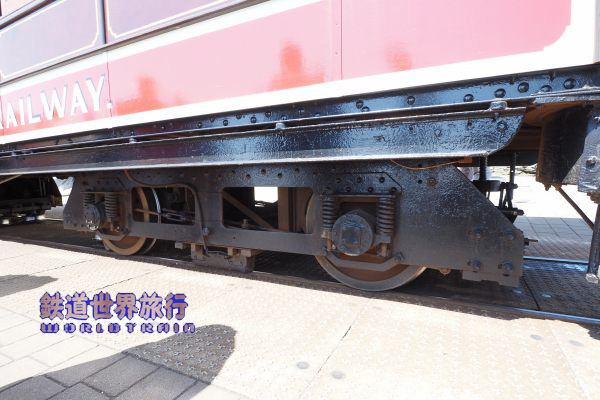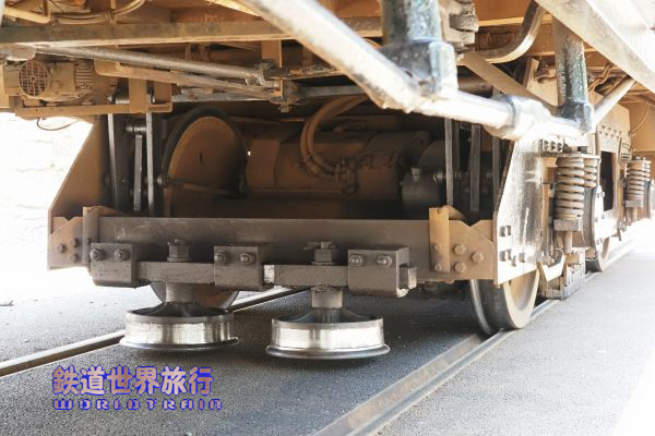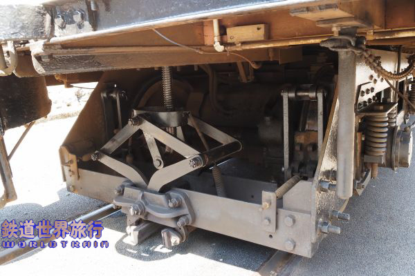 | センターのレールを掴むためのジャッキの様なブレーキ装置が台車の前側に付いている。 |