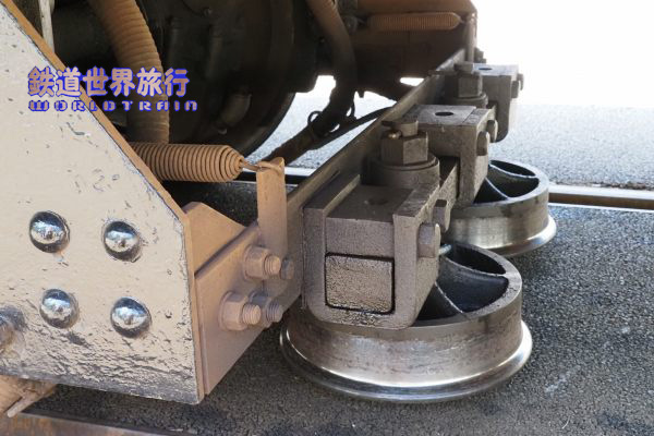 | 台車の内寄りには車輪状のガイドローラが水平に並んでいる。 |