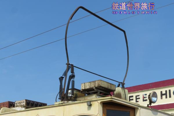 | 屋根上の前後に、ビューゲルが垂直に立っている。 架線に追従する機能は無く、垂れ下がる架線は持ち上げ、架線柱付近では架線に届かなくなるが、もう一つのビューゲルは接触するという考え方である。 |