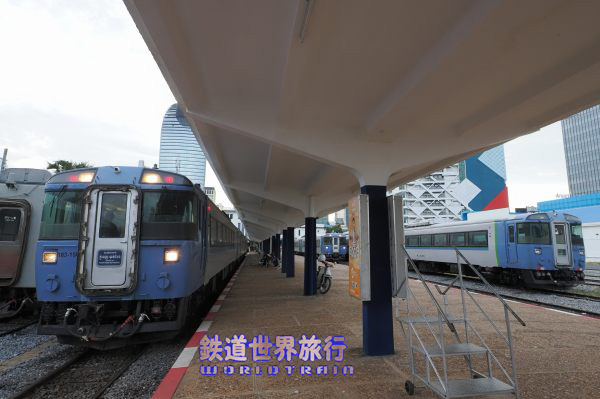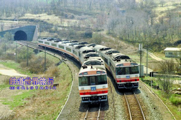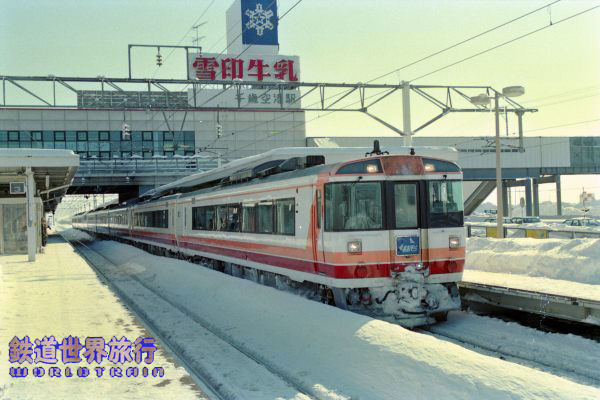 キハ183系500番台は国鉄末期の昭和61年(1986)11月のダイヤ改正から営業運転を開始、特急おおぞらや北斗の一部はキハ183 500番台ペアで使われていたキハ184の他は500番台系だけで運用されていた。後の南千歳駅が当時は千歳空港駅で当時の空港ターミナルビルと長い通路で結ばれていた。1987年1月撮影 |