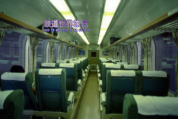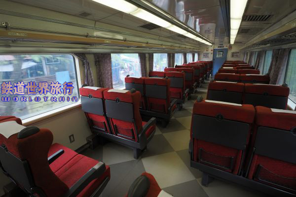 私が高校に入った年の夏休み、北海道フリーパスのグリーン車用を使って道内を周った時に撮ったキロ182-500番台の車内、この旅ではキロ182-500番台に3回乗っていて、オホーツク1号ではキロ183-503(後に改造されキロ182-7503となる)に乗っていた。 登場当初のハイデッカーグリーン車キロ182 500番台は座席が2+2配列で客室側にはスロープが無く通路が1段低くなっていた。1988年8月撮影 |