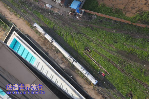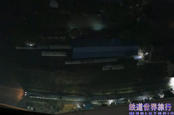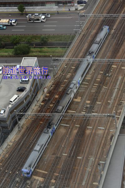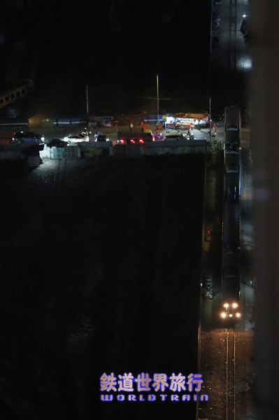 ロビー階に下りて駅方向を見ると編成が分割されいて入換作業中の様子。 昨日、すれ違った後、折り返し列車で追い抜いた列車の車運車と思われる。 |