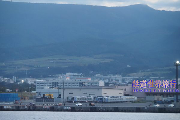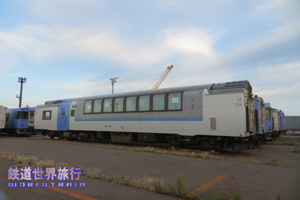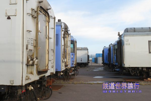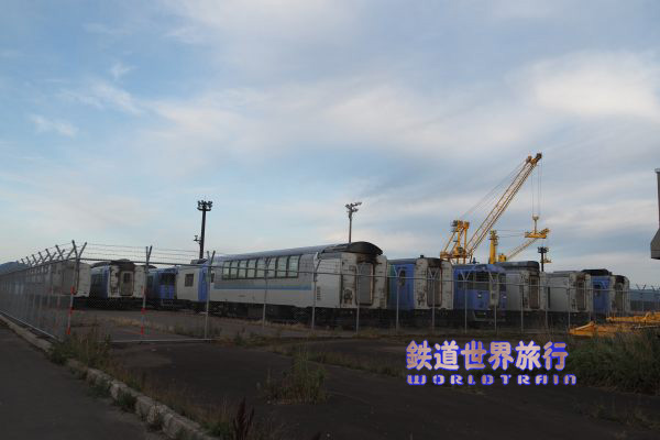 2023年7月に19両のキハ183系が函館貨物駅に甲種輸送され、当初は全車シェラレオネに輸出する予定で、9月に第1陣として8両を載せた船が出航。 私は旧南部縦貫鉄道七戸駅構内で行われたレールバス夕暮撮影会の帰りに青函フェリーの夜行便に乗った際、到着前の船上から第2陣の11両を見る事ができた。2023年10月撮影 |