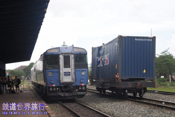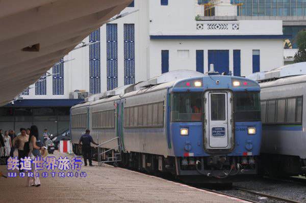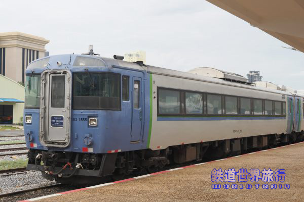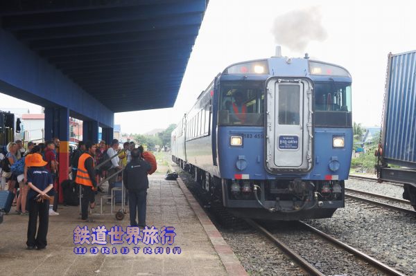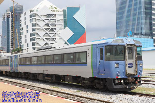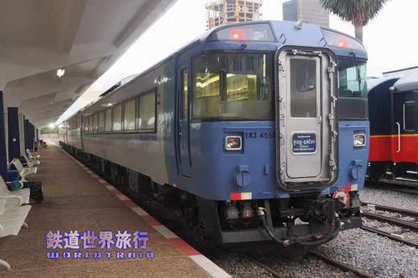 早朝、プノンペン駅に着くと、3年前までは札幌で見られたキハ183系の姿があった。 |