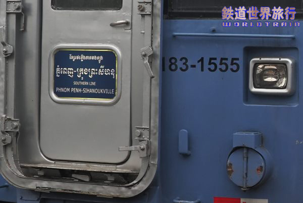 土日ともバッタンバン行きの3両目だったキハ183-1555、前面左側の窓下に車両番号が書かれ”SOUTHERN LINE、PHNOM PENH-SIHANOUKVILLE”と書かれたヘッドマークを付けていた。 |