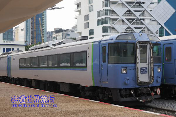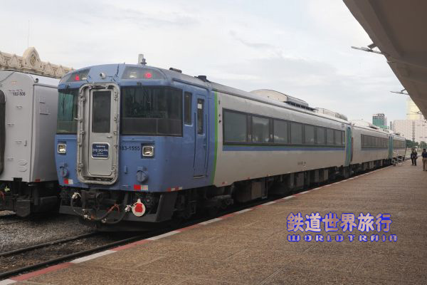 こちらの青スカート車はキハ183-1555で隣がキハ182-508、貫通路の塞ぎ板も日本から用意されていた。2023年10月撮影 |