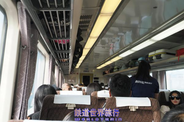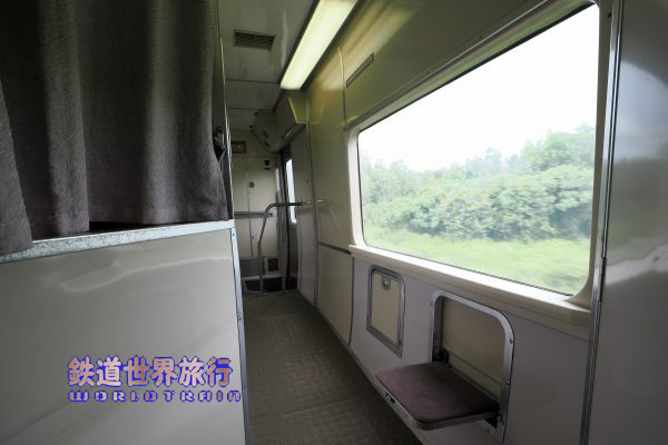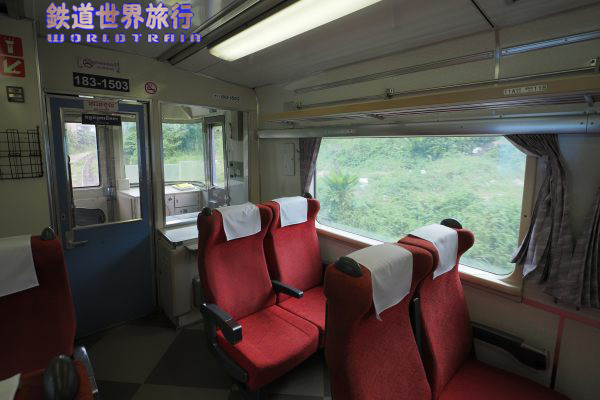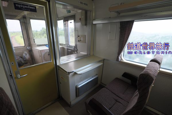 折り畳みテーブルが座席幅いっぱいまで大きくなった新しいタイプの座席で、窓下に電源コンセントがあり、床はタイル風に模様となっている。 折返しのプノンペン行きでは最後尾となるこの車両はほぼ乗務員専用となっていた。 |