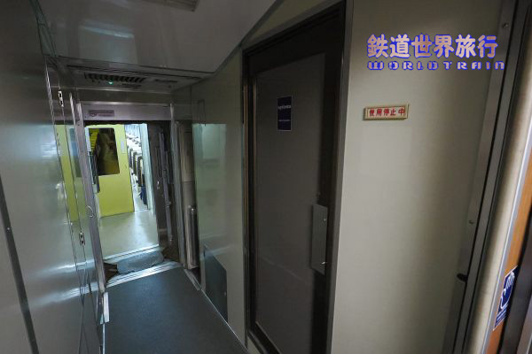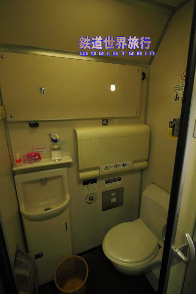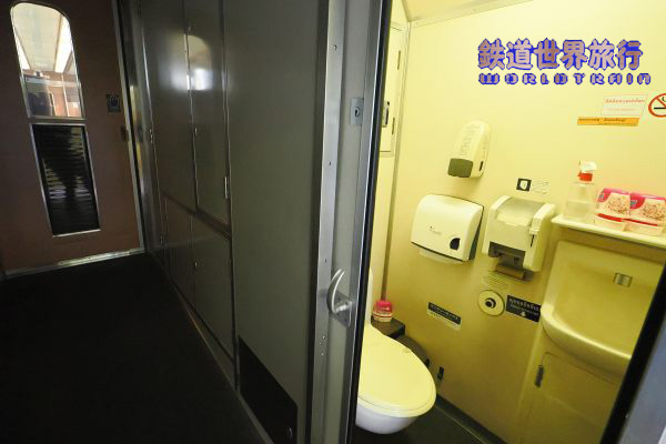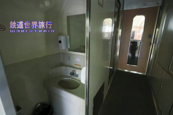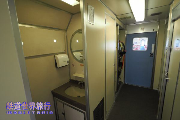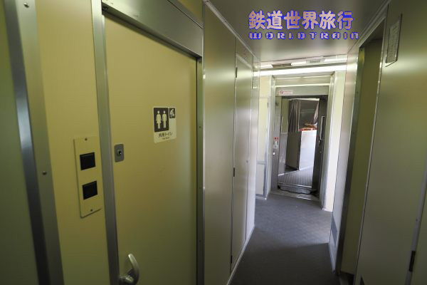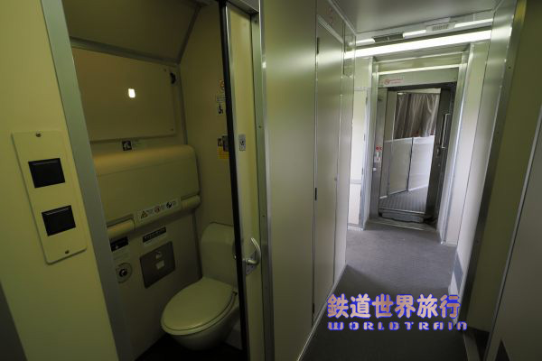 First Class客室の先も通路がスロープ状となっていて業務用室とトイレ、洗面所がある。 |