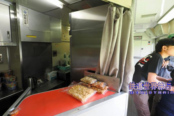 キロにある車内販売準備室のカウンターではスナックやカップラーメン類が販売されていた。 往路は座席がほぼ満席だったためか、乗務員がこの周辺に集まっていた。 |