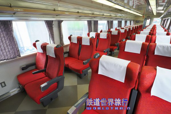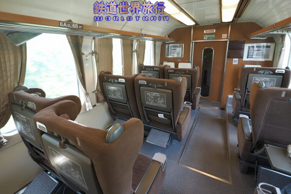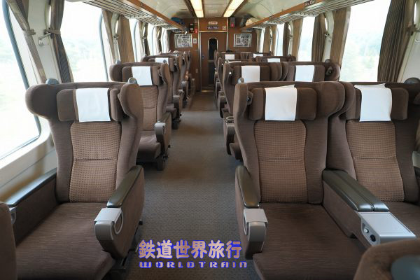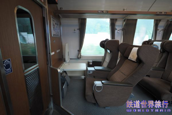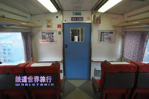 抽選で当たった北海道新幹線試乗会の後、特急北斗でグリーン車に乗った時のキロ182-7551の車内。同一車両ではないが、異なるのは仕切扉上の「禁煙席」「指定席」や号車札と、その脇の1列側の壁のラックに車内誌が入っていて、その隣に広告スペースが無かった事と、枕カバーくらいだろうか?2016年2月撮影 |