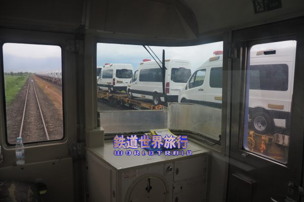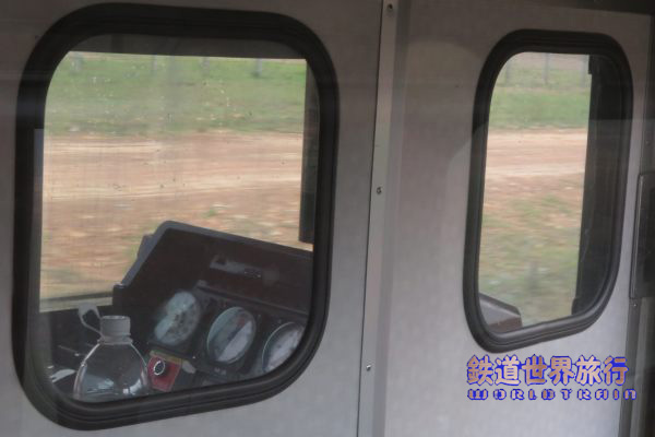 3両目の後ろ寄りの席に座り、満席状態で隣にも人が座っていたので席から振り返って後方の眺めを望遠で撮影、キハ183系はメキシコ製ディゼルカーの陰になり見えなかった。 |