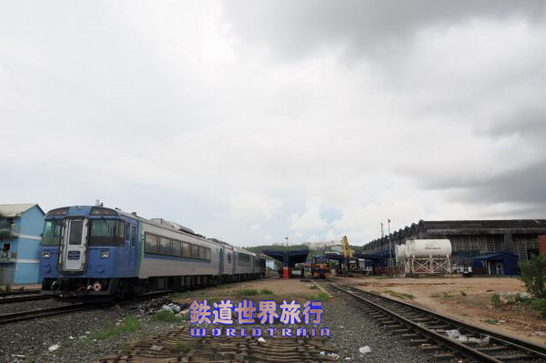 前日、車運車から車を降ろしていたホーム南側の線にキハ183系の3両編成が2編成縦列で停められ、カンボジアにやって来たキハ183系11両のうち北寄りにあるキロ182以外の10両がまとまっていた。 |