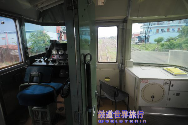 車掌室内も特に改造された様子はなく、各種スイッチの近くにカンボジア語が手書きされたシールが貼られていた。 |