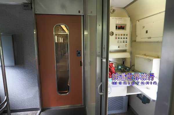 車掌室向かいのスペースには、伸縮式の折り畳みステップが置かれていた。 各停車駅には乗降用ステップが常備されているので、こちらは通常の停車駅以外で乗降が必要な場合に備えた物と思われる。 |