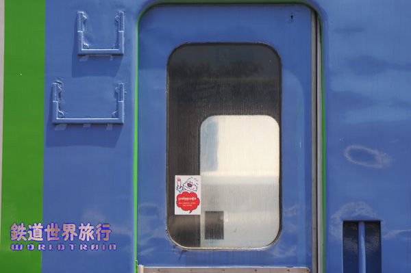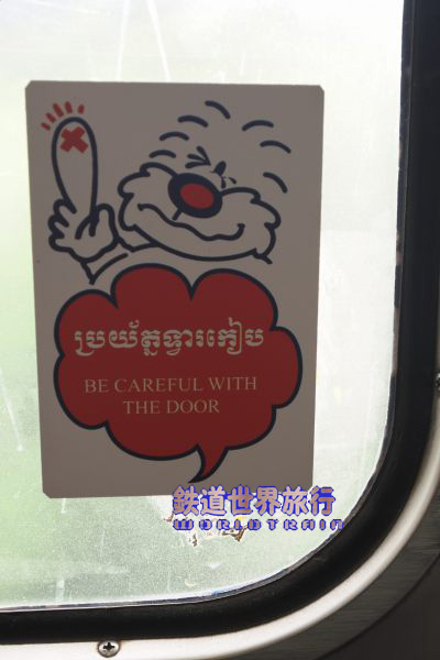 戸窓に貼られていたJR北海道のキャラクター、モジャくんのイラストが引き継がれ、コメントがカンボジア語と英語になって更新されていたのは驚き。 |