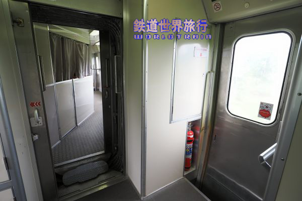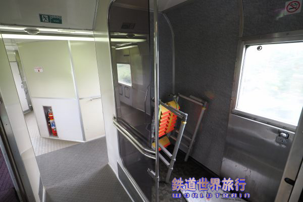 デッキと連結部、消火器はMORITAの日本語表記があるもので、JR時代からの物の様である。 |