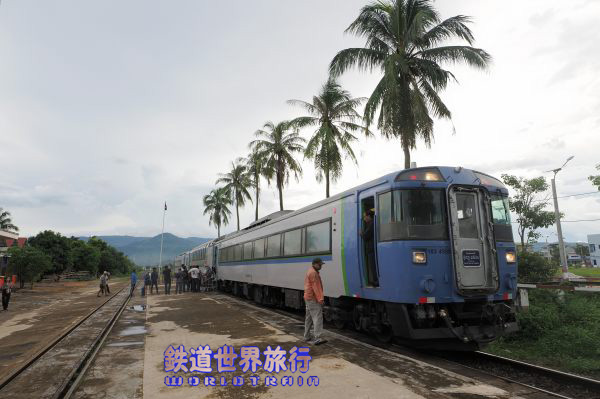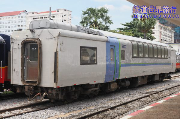 しばらくすると乗降口にタラップが設置された。 編成の反対側も”SOUTHERN LINE、PHNOM PENH-SIHANOUKVILLEと”書かれているが南線バッタンバン行きで、先頭からキハ183-9561、キハ182-7557、キハ183-1555という編成。 |
