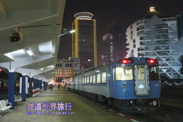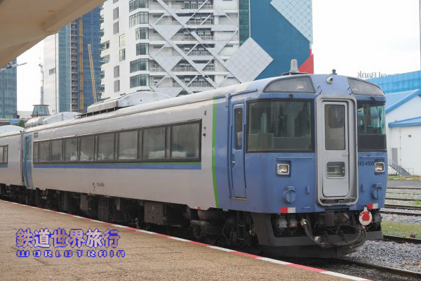 土曜日は留置車で日曜日のバッタンバン行きの先頭だったキハ183-4559、こちらは番号が前面の左側窓下に書かれていて、ヘッドマークの掲出はなく中の蛍光灯やローラーが見える状態、5両あるキハ183のうち幌が付いていないのもこの車両だけだった。 |