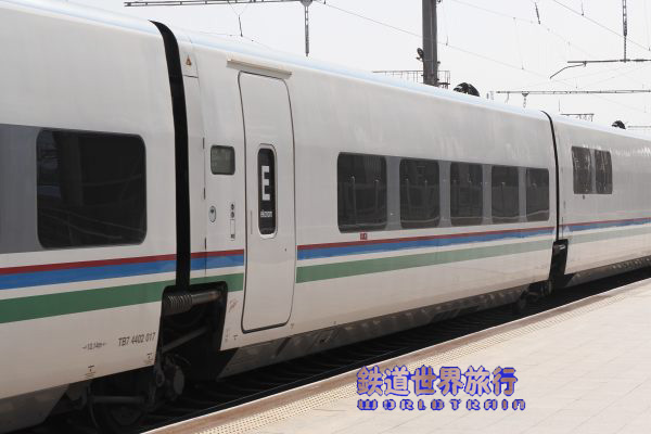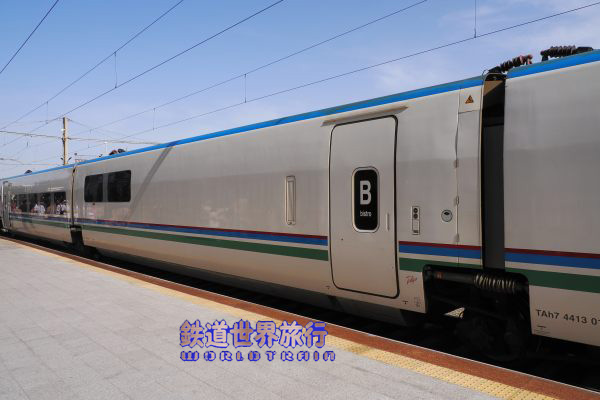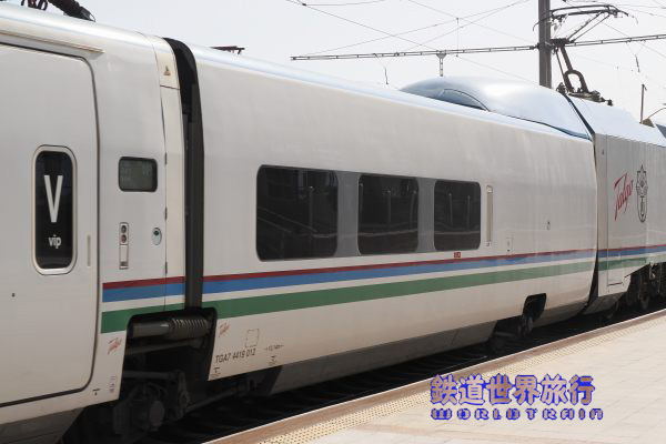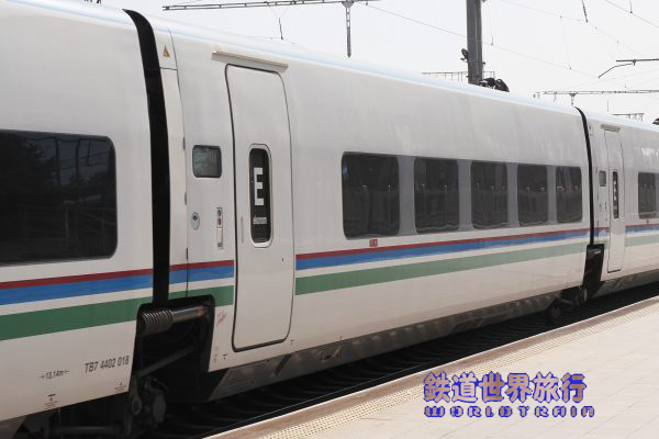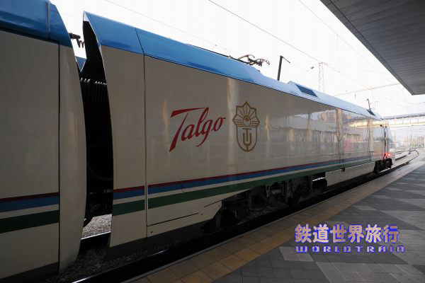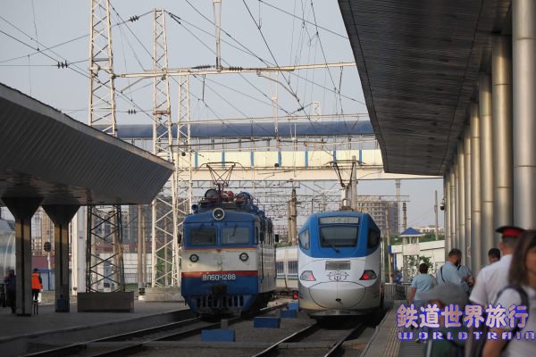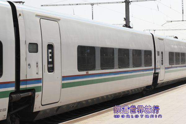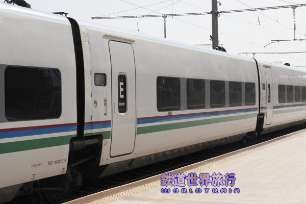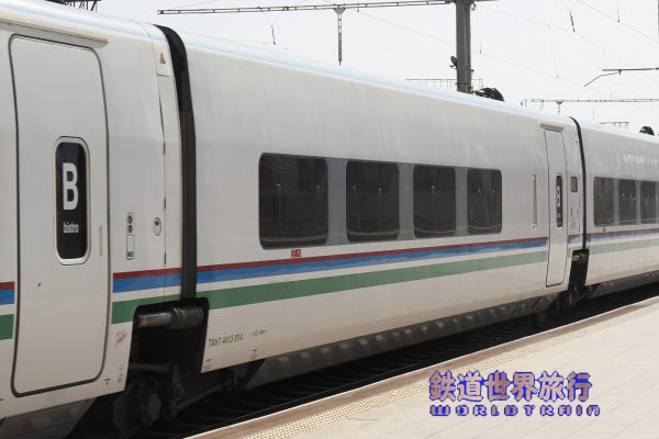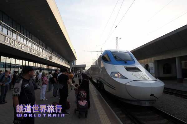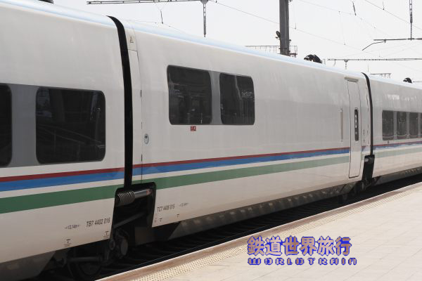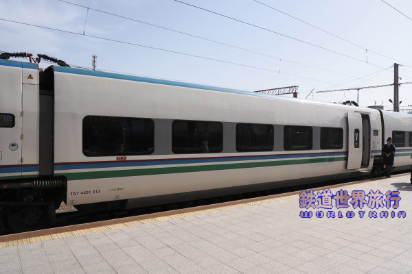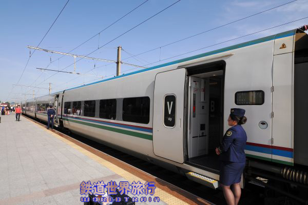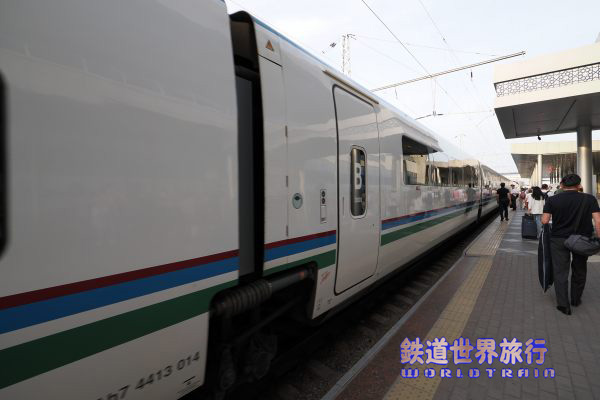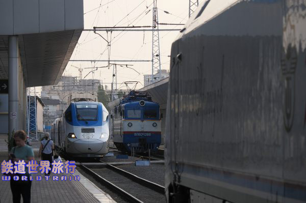 | 後ろ側の先頭車を撮影後乗車しようとしたら、入口に立っている車掌に違うと言われ、手を挿した方向を見ると、遠くに別なAfrosiyob編成が停まっているのが見えた。 |