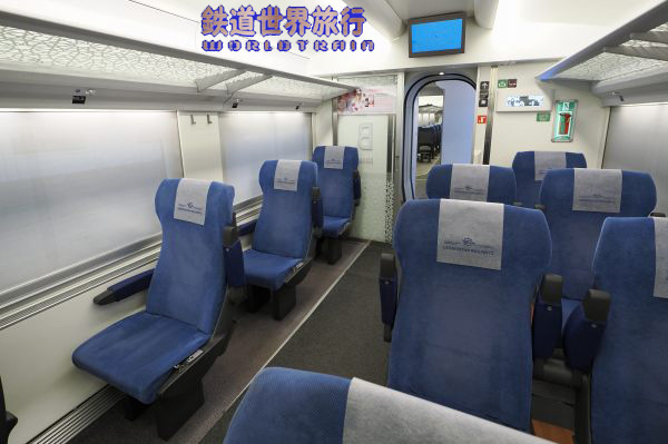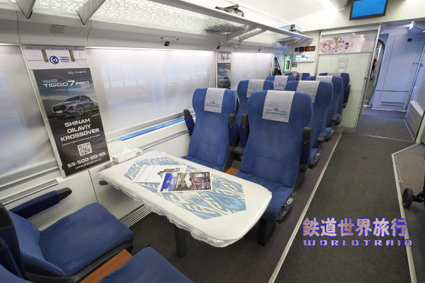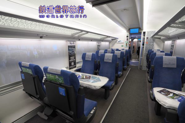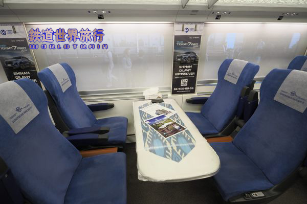 | 隣のVIPクラスも2+1配列であるが、革張りシートで広告が無く落ち着いた雰囲気になっている。 方向固定で向かい合わせで2ボックス分あり、窓が3つ分の長さなので動力車寄りの方は1つの窓を挟み、連節側は座席間に柱がある位置関係になっていてチグハグ感は少ない。 |