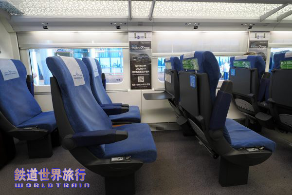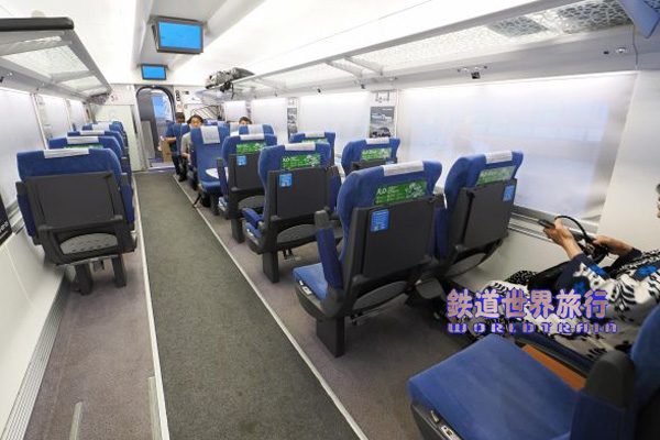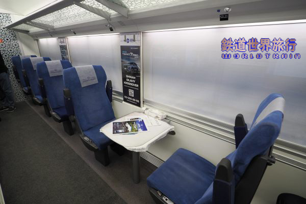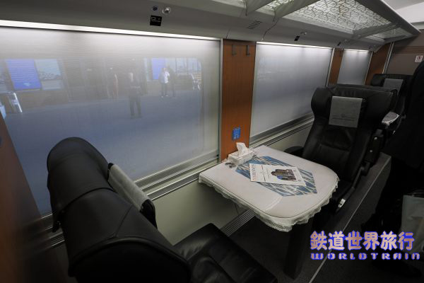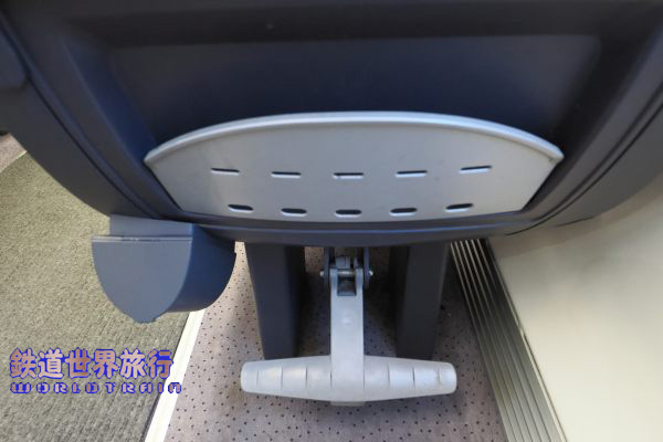 | 座席は少な目であるが座面スライド式でリクライニング可能で、肘掛下にリクライニングのノブとイヤホンジャック付きオーディオスイッチパネルがある。 座席と窓のピッチが合ってなく場所による当たり外れの差が大きく、この車両で車窓を楽しめるのは客室端と3列目だった。 |
