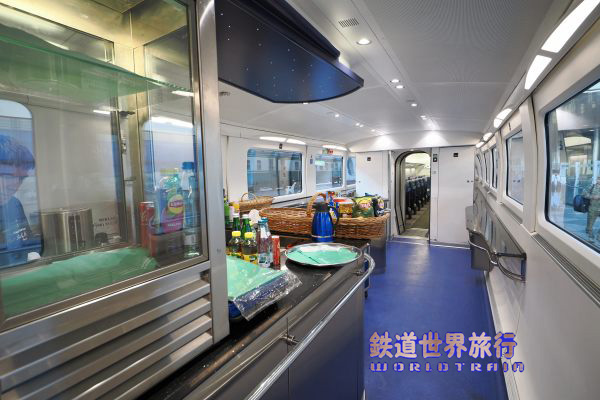 | ビジネスクラスの8号車とエコノミークラスの7号車にビストロ車両があり、デッキ側に厨房があり片通路となっている。 |