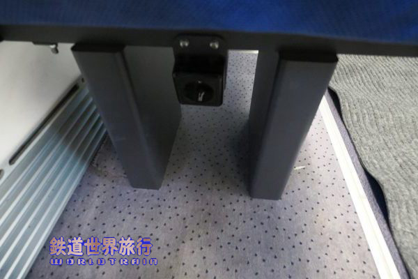 | 向かい合わせではない前席背面には折り畳みテーブルの他、T字形のフットレスト、樹脂製のマガジンラック、屑物入れがある。 |