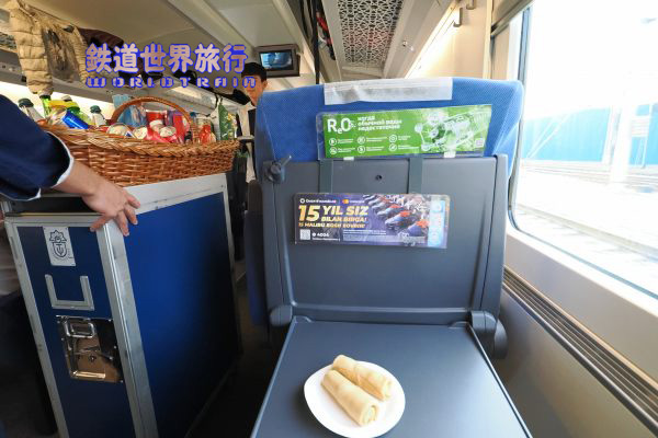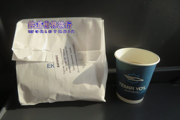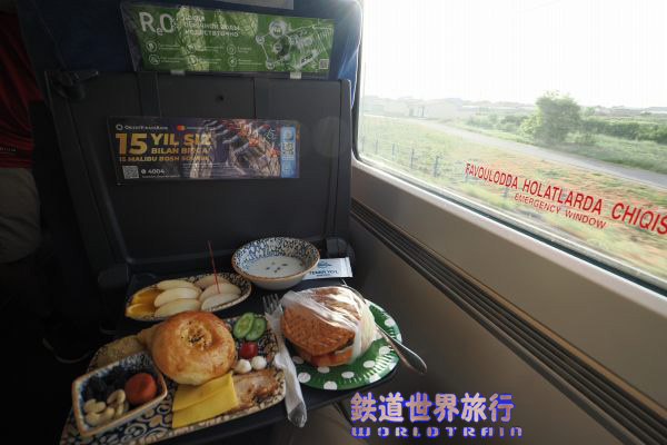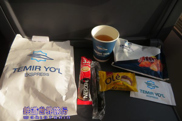 | 食事を待っている間に車内販売が来てクレープ状の物があったのが2つとエスプレッソで125,000S'omと言われ、高すぎると思い返した。 |