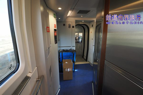 | こちらは先に出て行った編成の写真で戸窓の表記が異なっていた。 乗降扉はプラグドアで開くと下部の外部ステップが出てくる。 床面が低いタルゴ車両であるがホームが低いので高低差が大きい。 |
