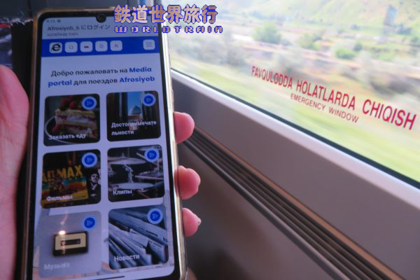 | サマルカンドには定刻より2分程の遅れで到着、8分ほど停車して終点カルシへ向かって発車して行った。 この列車の愛称 アフラシャブ はサマルカンドにあった古代都市の名前に由来している。 |