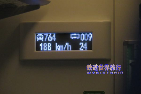 | 仕切扉脇の表示器は下段がスクロールで速度も表示され、ずっと見ていたわけではないが、200km/hを越える表示は見られなかった。 |