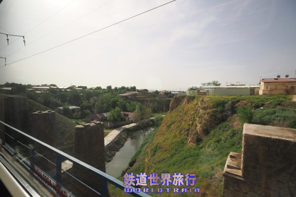| サマルカンド到着の少し前で川を渡る。隣のレンガ造りの橋脚は旧線なのか、増線工事なのか気になった。 |