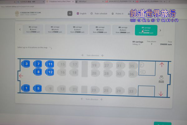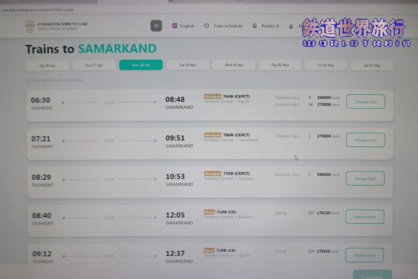 | チケットはウズベキスタン鉄道のホームページから予約購入、予約は45日前からと思っていたが、もっと早く予約できる様になっていた様で、練習の為その少し前に試そうとしたら、もう予約可能な状態になっていた。この日のサマルカンドまで行けるアフラシャブ号は6:30、7:21、8:29の3本あったが既にVIPクラスは全て売切れ、ビジネスクラスに空きがあるのは朝1本目だけになっていた。 |